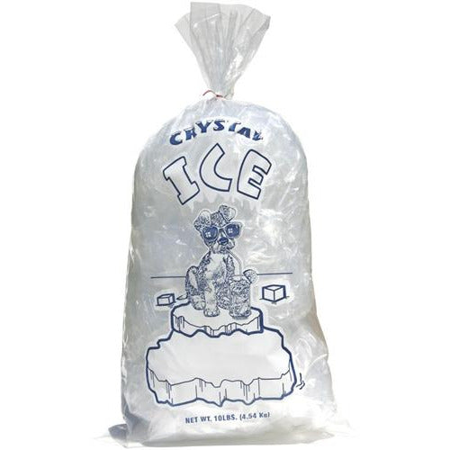 Estas bolsas de hielo transparentes "CRYSTAL ICE" con precio al por mayor 8 libras están preimpresas con la parte superior abierta. Cada estuche viene con bridas de plástico para cerrar las bolsas de hielo Crystal Clear 8LB de forma segura. Las bolsas están preimpresas con una imagen de un perro "cool" sentado sobre hielo y el texto "CRYSTAL ICE". Las bolsas de hielo preimpresas con parte superior abierta 8 lb están en stock y listas para entregarse de inmediato. Están elaborados con resinas vírgenes, aprobadas por la FDA y el USDA para el contacto con alimentos y dan una sensación muy purificada e higiénica. Se ha agregado EVA a estas 8# Bolsas de hielo para aumentar su fuerza y resistencia a las perforaciones, al tiempo que reduce la fragilidad a temperaturas heladas de -20 F.